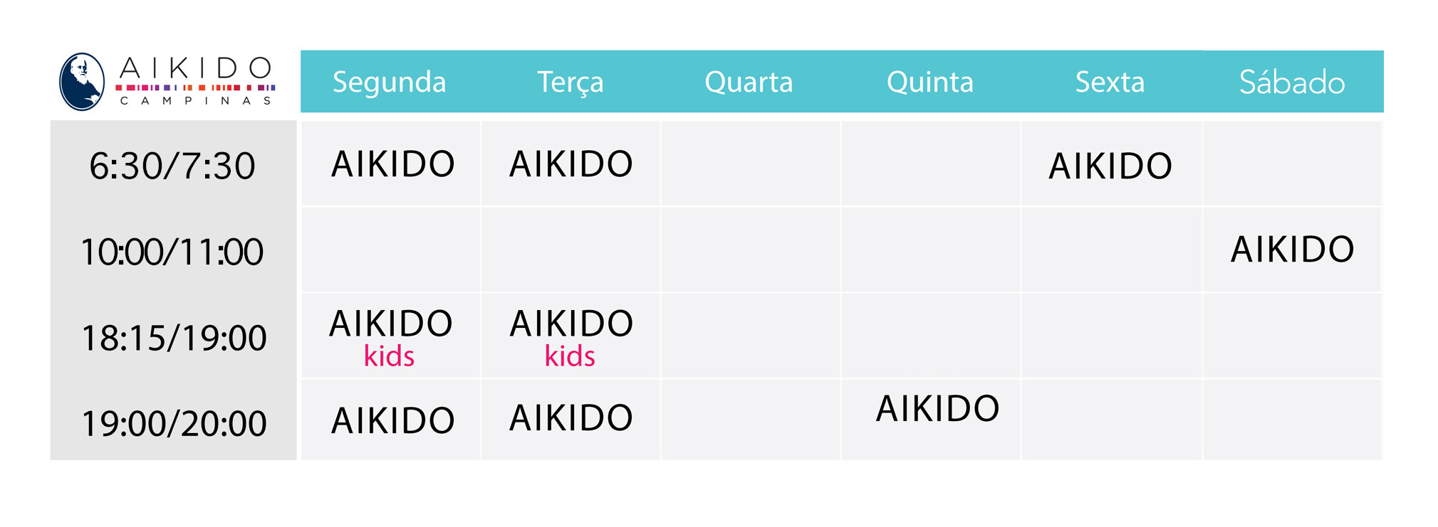 O Aikido Campinas oferece classes pela manhã às 6:45hs e á partir das 19:00hs. Se você não conseguir vir de noite procure fazer uma aula de manhã, ou ao contrário. É possível, aliás bem provável, que você se sinta frustrado com a complexidade técnica do Aikido, mas com a repetição o treinamento vai ficando mais fácil. Perseverança e força de vontade fazem parte do treino, a prática leva a perfeição!